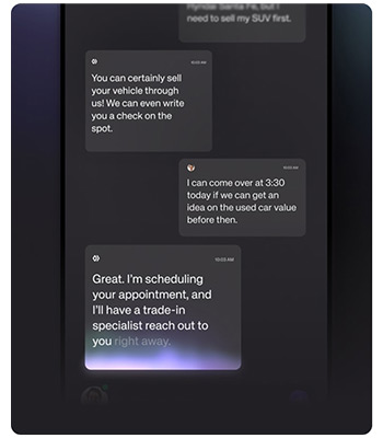 - Know the car. Know the buyer. VIN-level detail, trade-in queries, financing questions, appointment scheduling— automatically handled. Your team can focus on closing, not chasing.