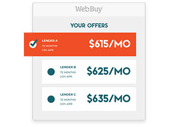 Customers can PREQUALIFY for realistic rates and payments early in their journey as they are initially structuring their deal or from a dedicated “Prequalify” CTA. Then, as they continue, WebBuy’s innovative BidBoard® allows your customer to submit a credit application and receive offers from your partner lenders within minutes via our integration with RouteOne® or DealerTrack®. Buyers have their credit processed, routed to your lenders, and receive real auto-decisioned offers – with you, the retailer, controlling and growing your backend profitability.